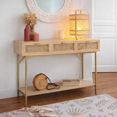 Aparador Rattan Natural con Cajones y Base Dorada 110 cm