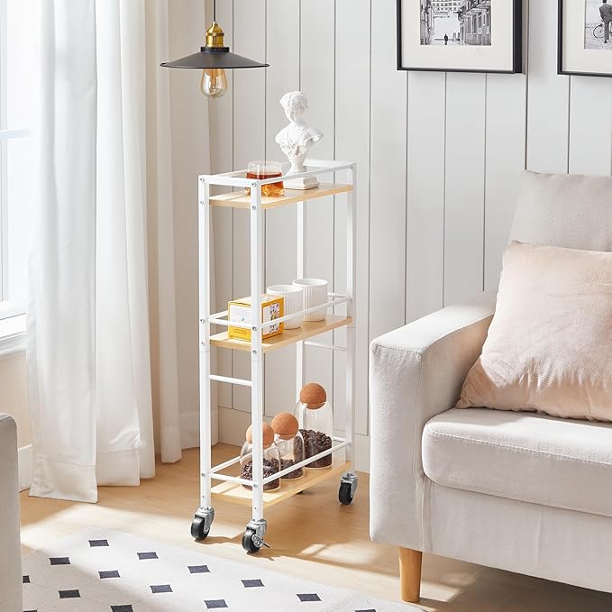 Cuenta con una estructura metálica blanca resistente y repisa de MDF con terminación madera, combinando funcionalidad y un look moderno y liviano. Sus 3 niveles abiertos permiten organizar aliños, botellas, frascos, utensilios o elementos decorativos de forma visible y ordenada.