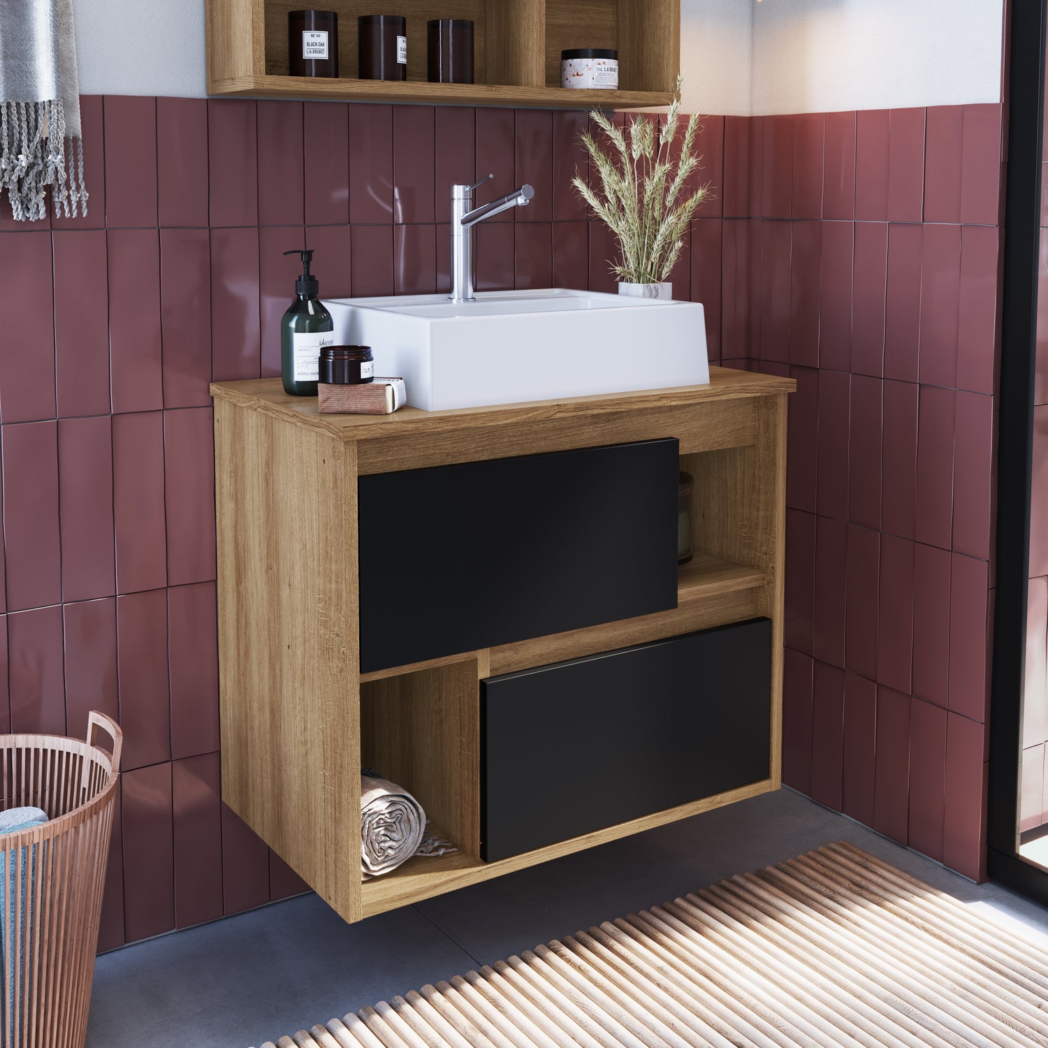 Este vanitorio mural optimiza el espacio mientras ofrece un diseño de alta calidad y sofisticación. Ideal para quienes buscan una solución de diseño moderno y funcional para su baño.