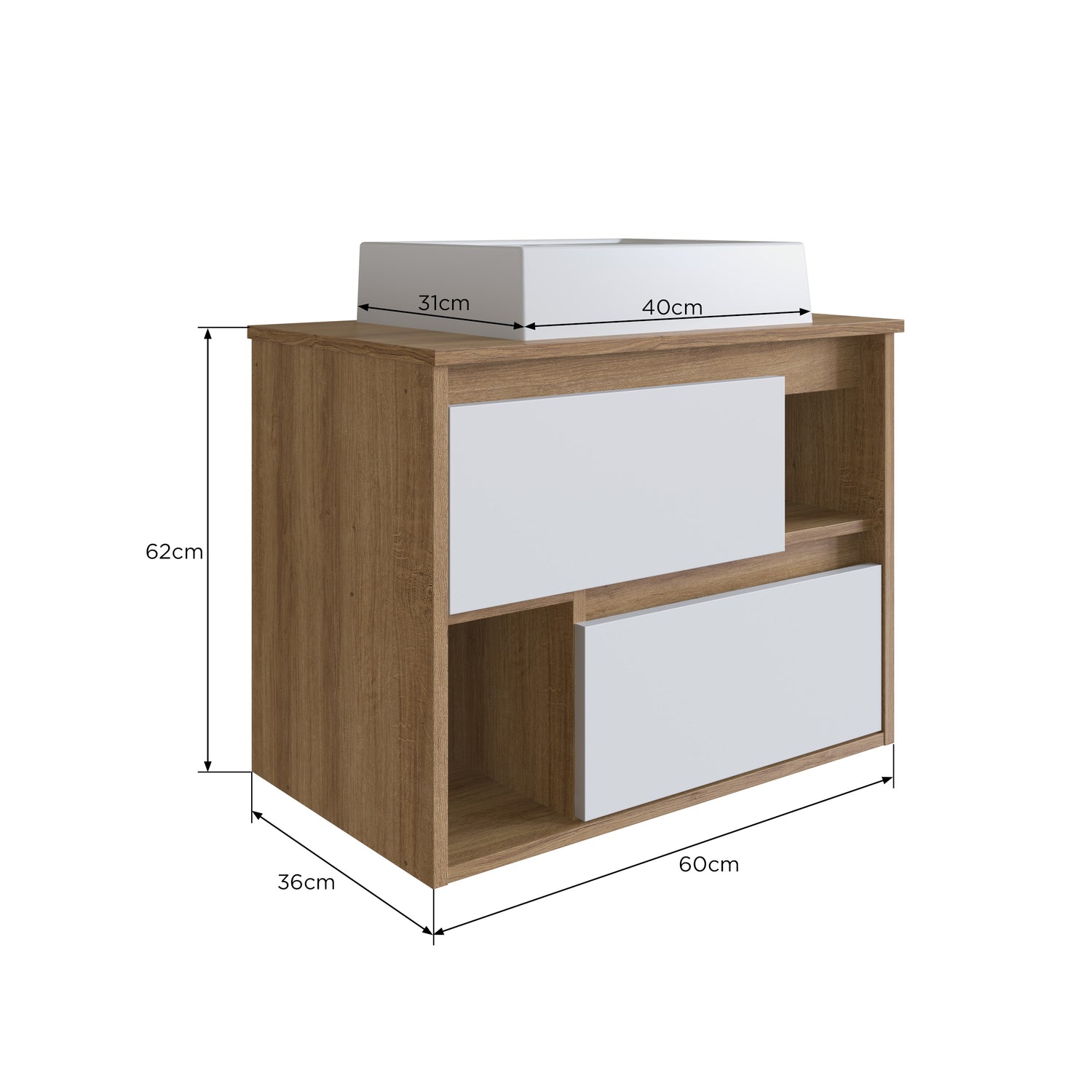 Medidas del Mueble: Con unas dimensiones de 62 cm de alto, 60 cm de ancho y 36 cm de fondo, este mueble es ideal para baños que requieren aprovechar el espacio disponible sin sacrificar estilo o funcionalidad.